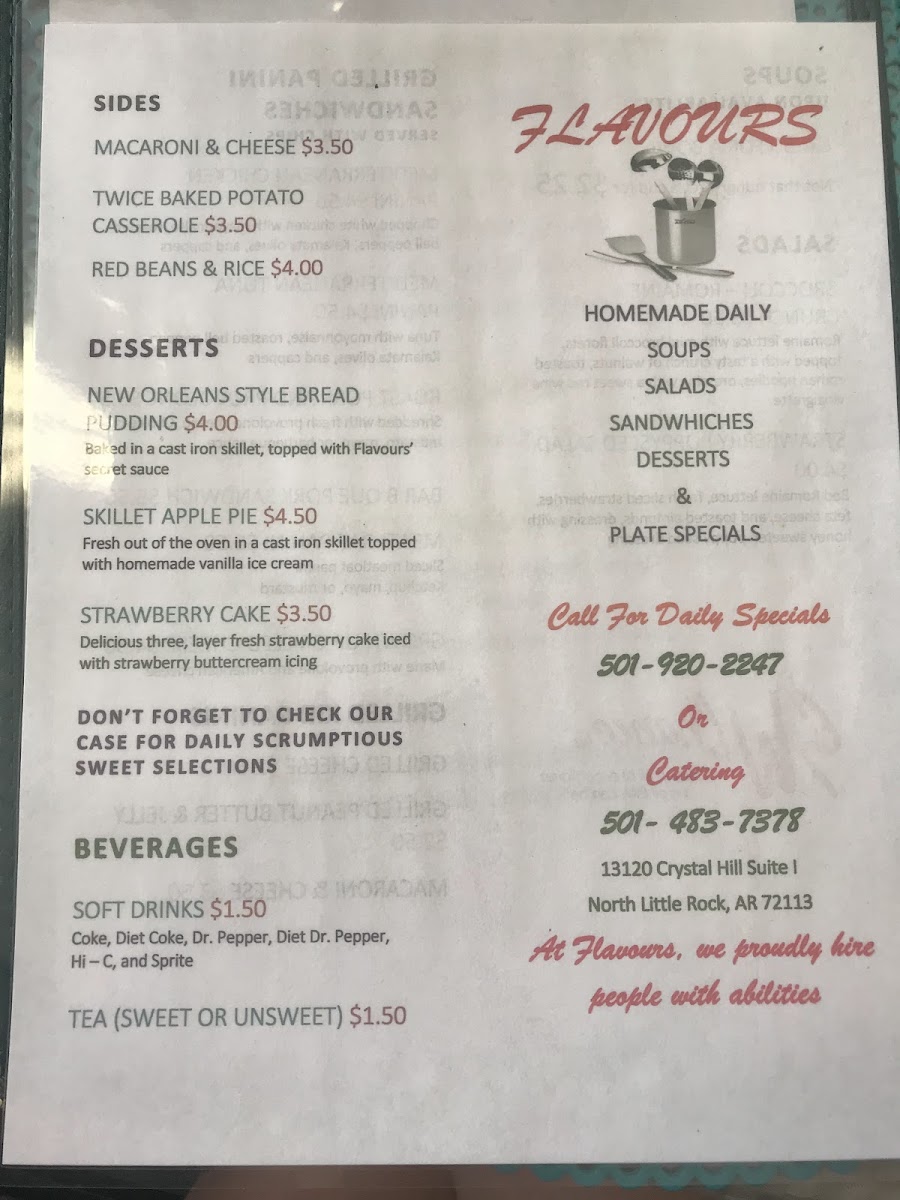 At Flavours Maumelle Menu, the culinary experience is crafted with fresh, vibrant ingredients designed to satisfy every palate. Whether you're craving savory comfort food or something a bit more adventurous, there's something to suit every taste. Each dish is prepared with a focus on quality and flavor, ensuring a delightful dining experience from start to finish. From mouthwatering appetizers to hearty mains, the menu at Flavours offers a wide selection that brings something new to the table. For those with a sweet tooth, the dessert options are the perfect finish to a delicious meal. Whether you're stopping by for lunch or dinner, you can always expect a warm welcome and a satisfying bite.
